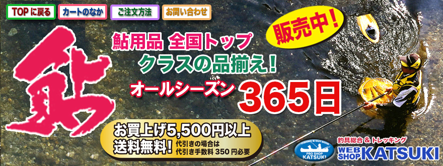 ネットショップ」は、友釣りファンのためのトップクラスの豊富な鮎釣り用品のアイテムが自慢のまさに『鮎つりの王国』です。コアな鮎釣り師からビギナー鮎釣り師までが納得の鮎つり用品専門ショップを目指し、実店舗『かつき』の鮎つり用品の品揃えを全国の鮎釣りファンにお届けできるよう2万点を超える商品群はまだまだ増殖中です。鮎つりをこよなく愛する友釣りファンのための『鮎つりネットショップ』をお楽しみ下さい。釣具通販。