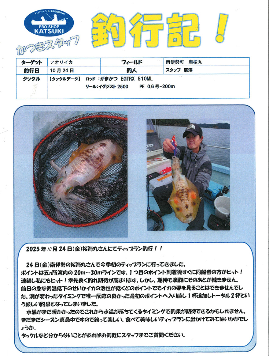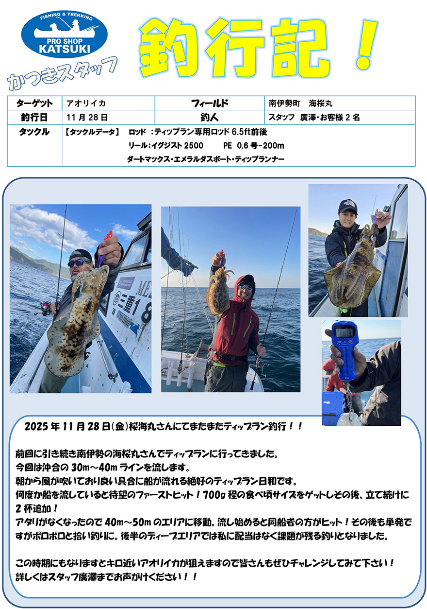2024年初釣りに鳥羽のKAIEIMARUさんへジギングに行ってきました! 直近の釣果情報では日ムラはあるものの比較的釣れている状況ということで期待に胸を踊らせながらいざ出船! まずは湾内を軽く見て、すぐに見切って沖へ出ました。しばらく探っていると、高速巻きからの跳ね上げでのフォールでヒット! 残念ながら残り数メートルでフックアウト そこからまたしばらく沈黙に。次のバイトはジグのフォール中でした! 上がってきたのはサゴシ大!嬉しい一匹でした! 昼前まで沖を探るも船中は僕のサゴシ大とワラサ1本と厳しい展開に…昼前に湾内へ移動するとジギング船、餌釣り船の大船団! 時合いに突入し、そこからは連続ヒット! 昨年のリベンジに燃えていた同船者さんも見事ワラサをキャッチ! 湾内ということで、ヒットジグはFKジグTG、TGベイトとシルエットの小さなショートジグでした! 帰ってお腹を開けて見ると、FKジグTG150gとまったく同サイズのサッパが入ってました! 湾内攻略にFKジグTGを忍ばせておくことをオススメします!! |