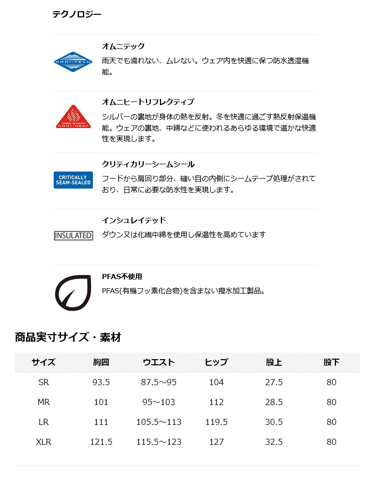 【特徴】 ・コロンビア独自の防水透湿機能「オムニテック」 ・コロンビア独自の熱反射保温機能「オムニヒートリフレクティブ」 ・縫い目にシームテープ処理 ・ウエスト後部:フィット感を高めるゴム仕様 ・裾:ドローコード ・裾内側:レッグゲイター ・存在感のあるドロップインチェストポケット ・収納物の落下を防ぐファスナー式のハンドポケット ・インターナショナルサイズのアクティブフィット ・スキーをはじめとする、ウィンターアクティビティに最適 ・スキージャケットとのセットアップもおすすめ [WE4984:Shotski Jacket] ●素材 表: ナイロン100% 裏: オムニヒートライニング(ポリエステル100%) |