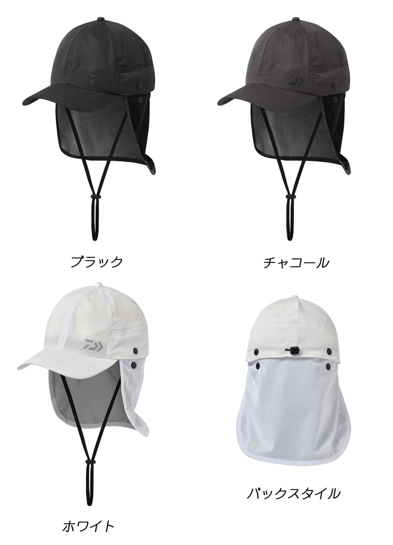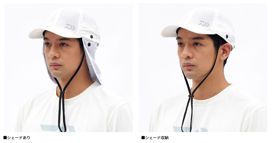 【ダイワ|キャップ|帽子|撥水】| ドットエア シェードキャップ DC-7826 |  | | 通気性に優れたドットエア素材を採用。通気性がありながら撥水性も兼ね備える。 後ろに収納可能な日よけシェードつき。 シェード部分には太陽からの熱が伝わりにくい遮熱生地を採用することで温度上昇を軽減。 風で飛ばされにくいよう、顎ひも付き(取り外し可能) |