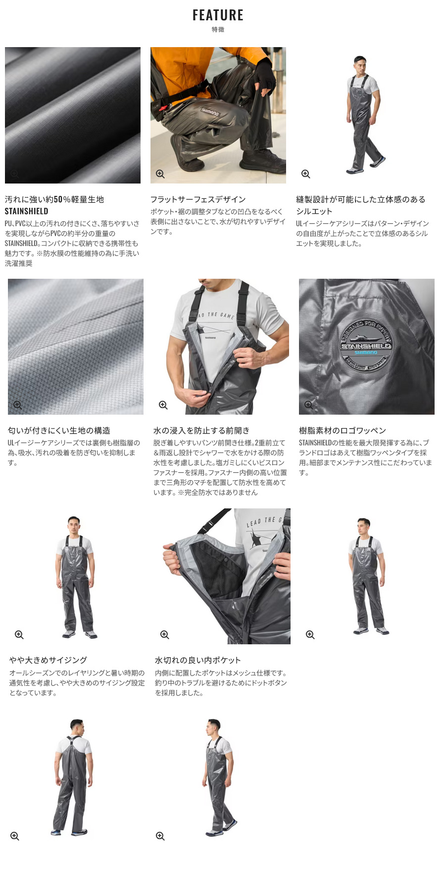 【シマノ|レイン|ビブ|軽量】ULイージーケア ビブ 05 RA-041Y |  | 汚れに強い軽量生地が船釣り・オフショアゲームを快適にします。 |