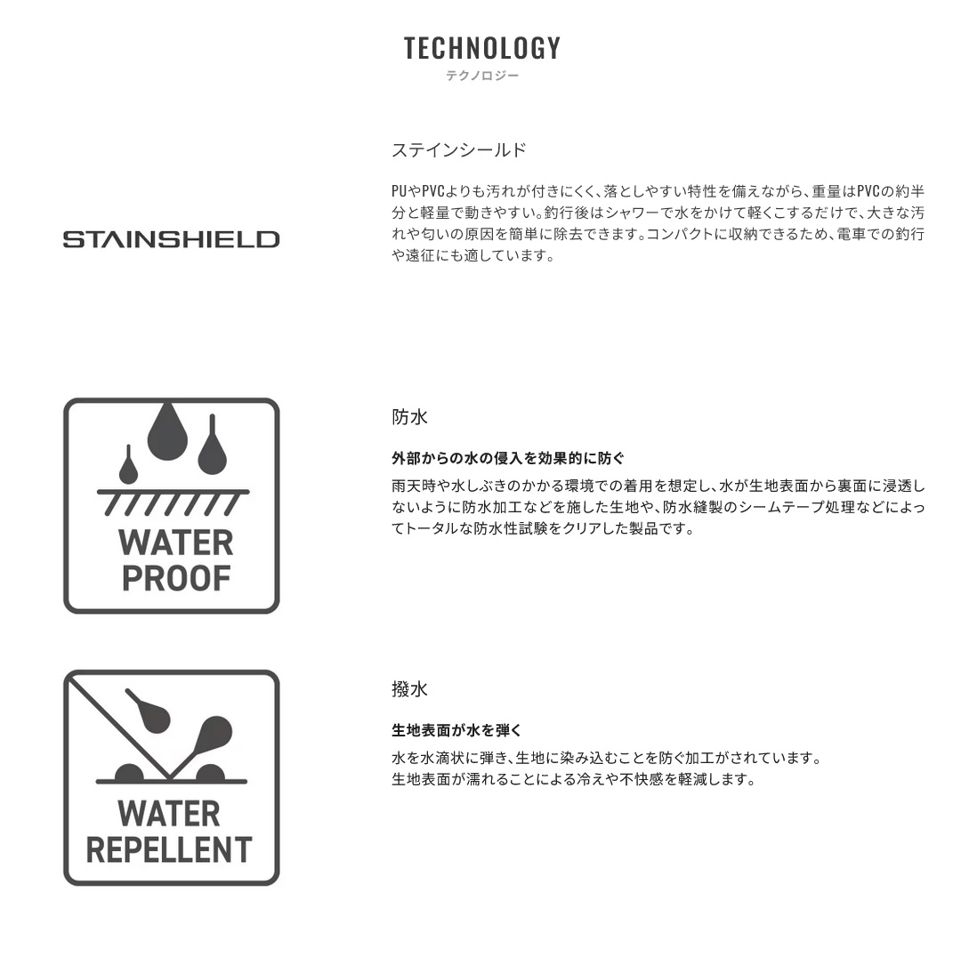 | PU、PVCといった従来の生地よりも汚れがつきにくい、汚れが落ちやすい、を実現した特殊生地、STAINSHIELDを採用しました。このSTAINSHIELDは、PVCの重さの約半分という軽量性能をもち、表面の特殊加工で水をかけて軽くこするだけで汚れや匂いの原因が落ちやすく、釣行後や移動時のストレスを軽減します。水や汚れのキレの良さと船釣りでのトラブルレス性を徹底的に重視したフラットサーフェスデザインを採用しました。コンパクトに収納できるため電車釣行や遠征にも適しています。軽量で動きやすく、船釣り師だけでなく、オフショアアングラーにもおすすめです。 |
