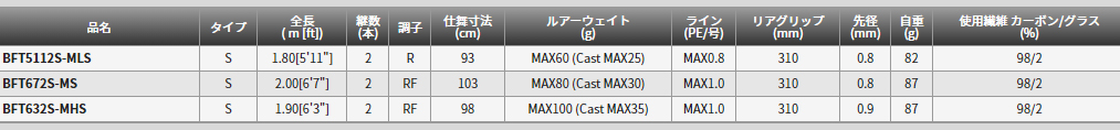 BFT5112S-MLS タフな状況と浅場を攻略するフィネスモデル 水深10〜30mにて20〜35g程のエギが扱い易く設定。繊細な穂先にした事で、水深が浅いエリアや船が流れ難い状況でもティップが変化を捉えます。取り回しが良いレングスに設定し、僅かな穂先の変化を目視し易い長さとしました。浅場でのバチコンや12号までのイカメタル、10〜25g程度のスーパーライトジギングにも面白いモデルです。(PE0.8号以内、リーダー3号以内のご使用を推奨します) BFT672S-MS 浅場から深場まで対応するバーサタイルモデル。 水深20〜40mにて25〜40g程のエギが扱い易い設定。喫水線の高い船など釣り座が高い状況で扱い易く、波の揺れを吸収しアタリを引き出すアクションが魅力。潮や風が緩く船が流れ難い状況では、キャストして広いエリアを探ることにも適しています。また15号までのイカメタルやバチコン、10〜40g程のスーパーライトジギングにも対応します。(PE1号以内、リーダー3号以内のご使用を推奨します) BFT632S-MHS 大物と深場を攻略するパワフルモデル。 深場や潮流の早いエリアの攻略や、大型アオリイカ狙いに焦点を合わせたモデル。水深20〜50m程で30〜50gが扱い易く70g以上のエギにも対応可能。ディープエリアで僅かな変化を逃さないティップと、潮流や大物の抵抗にも負けないバットパワーが魅力。20〜60g程のメタルジグを使ったスーパーライトジギングにも対応できます。(PE1号以内、リーダー3号以内のご使用を推奨します)