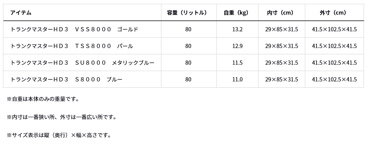 【ダイワ|クーラー|大容量|80L】| トランクマスターHD III VSS 8000 |  | 更に大容量!安心の大容量ボディーにうれしい機能を搭載したトランクマスターHDがサイズ追加して新登場! | ロングボディで大型青物もスッポリ収容可能。 高保冷の5面真空モデルから軽量スチロールモデルまで選べる保冷力。
