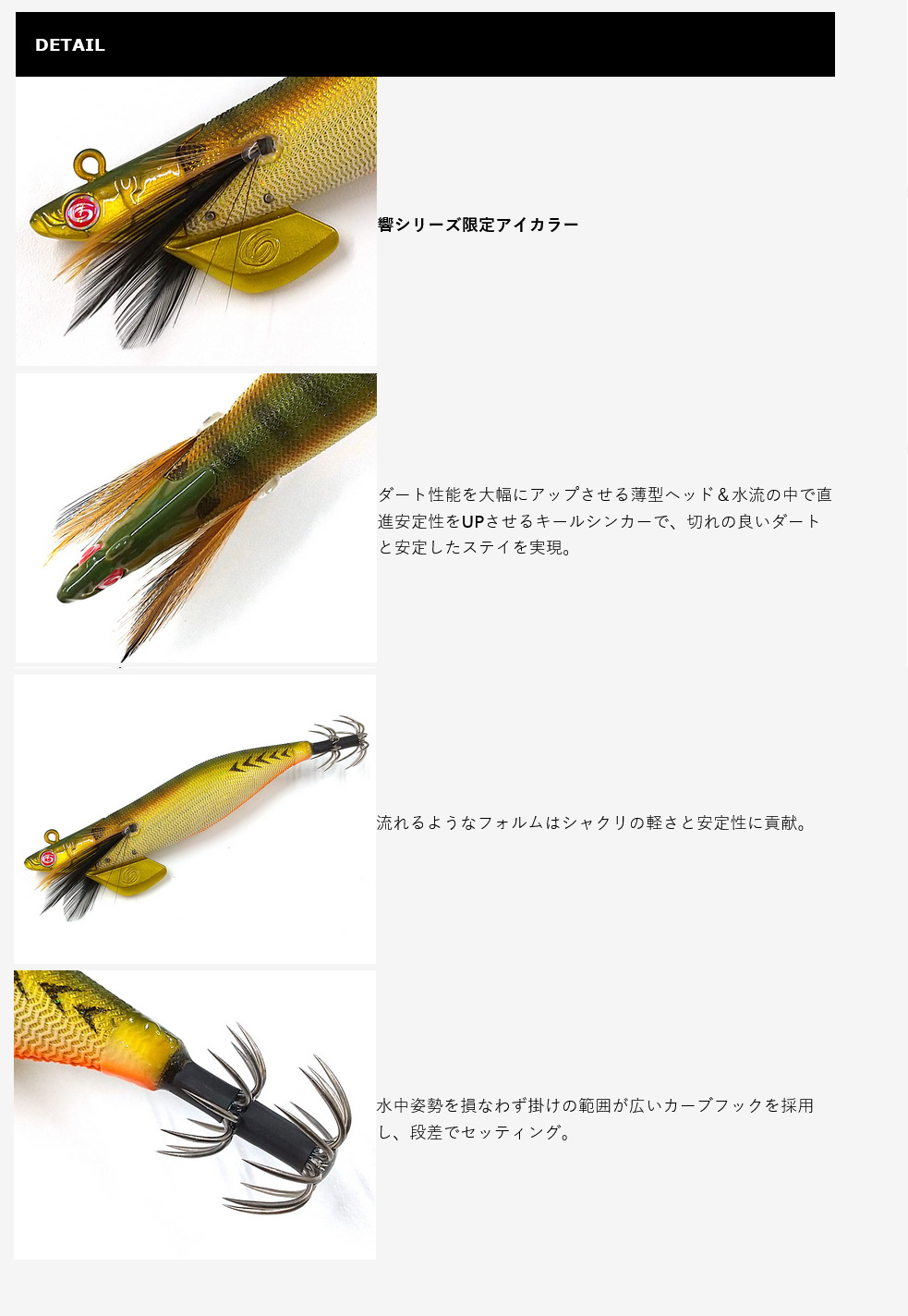 | 人気のカラーを厳選! 音による集魚効果で広範囲からイカを集める! ティップラン専用エギ、ティップランナーは、フォールの速さ、シャクリの軽さ、ダートの切れの良さ、流水時の安定性、停止時の姿勢、針掛かりの良さ、等その他諸々 ティップランに必要とされる要素全てを独自に検証し、最善と呼べる性能を追求。 その結果、まさに『熟成』と呼ぶべき進化を遂げ製品化された究極の専用エギである。 |