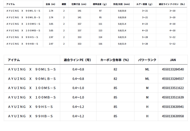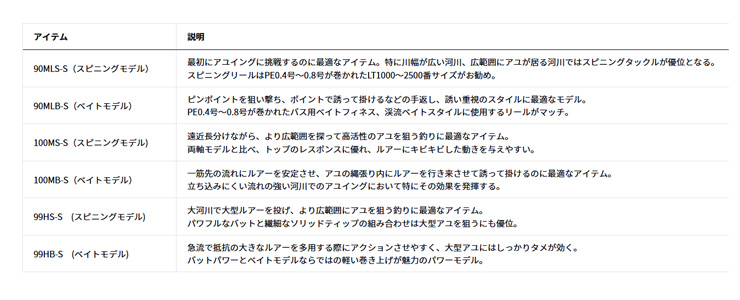 アイテム別特特徴 ■90MLS-S(スピニングモデル) 最初にアユイングに挑戦するのに最適なアイテム。 特に川幅が広い河川、広範囲にアユが居る河川ではスピニングタックルが優位となる。 スピニングリールはPE0.4号〜0.8号が巻かれたLT1000〜2500番サイズがお勧め。■90MLB-S(ベイトモデル) ピンポイントを狙い撃ち、ポイントで誘って掛けるなどの手返し、誘い重視のスタイルに最適なモデル。 PE0.4号〜0.8号が巻かれたバス用ベイトフィネス、渓流ベイトスタイルに使用するリールがマッチ。