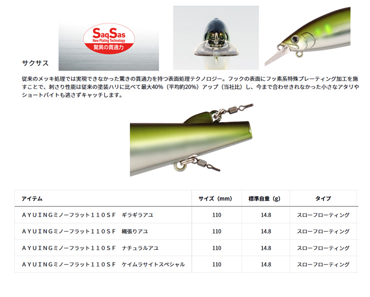 サイズ:110mm=14.8g フック:アユイングフックSS キープ7.0×2個