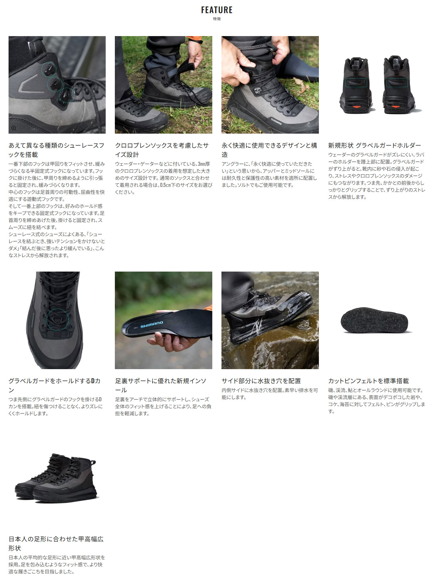 ジオロックシステムと3種類のシューレースフックを搭載した、高機能ウェーディングシューズです。甲回りを固定する半固定式、足首の動きを妨げない遊動式、好みの締め具合を保てる固定式の3種のフックにより、快適なフィット感を実現。結び中の緩みを防ぎ、ストレスを軽減します。