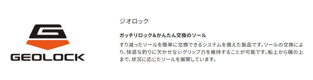 ソール部は、ジオロックシステムにより地形や摩耗具合に応じたソール交換が容易にできます。カットピンフェルトソールは岩場でも高いグリップ力を発揮し、ソルト・淡水問わず活躍します。