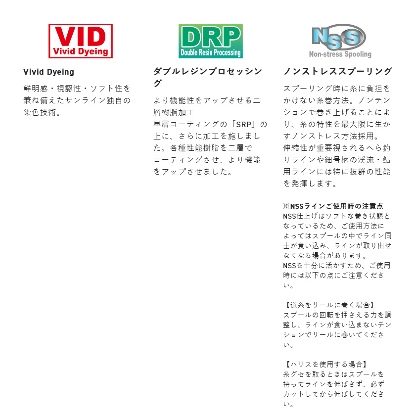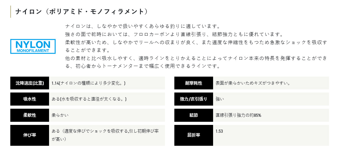 |  | | | 渓魚を欺く、実績の黒糸。 ●超復元性の特殊ナイロンを採用。軽く柔らかい糸質が仕掛けの操作性を高めます。 ●ナイロン特有のクッション性と高い結束力を発揮して大物とのやり取りにも臆しません。 ●独自の「ブラック」カラーが光の乱反射を軽減。魚に警戒心を与えず仕掛けを口元まで届けます。 ●DRP加工によるスベリ性と撥水性で竿へのベタ付きを軽減します。 ●「ノンストレススプーリング(NSS)」を採用し、ラインの負荷を軽減することで巻き癖の発生を抑えます。 |