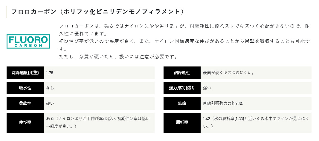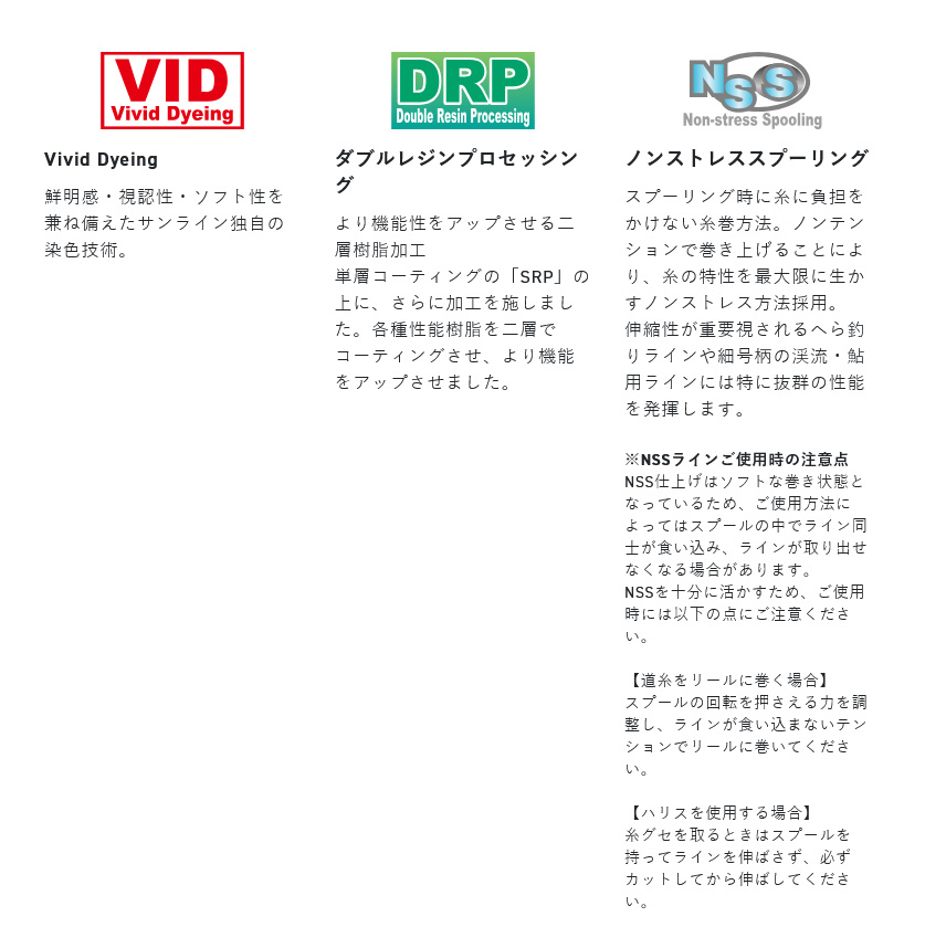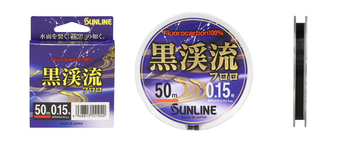 【サンライン|ライン|渓流|フロロ】| 黒渓流フロロ |  | | |  | | | 渓魚を欺く、実績の黒糸。 ●超高強力フロロカーボンを採用。細くても強い糸はスレた大物の捕獲率を高めます。 ●高比重かつ耐摩耗性に優れたアドバンテージにより果敢に渓魚の縄張りに攻め込めます。 ●独自の「ブラック」カラーが光の乱反射を軽減。魚に警戒心を与えず仕掛けを口元まで届けます。 ●DRP加工によるスベリ性と撥水性で竿へのベタ付きを軽減します。 ●ノンストレススプーリング(NSS)」を採用し、ラインの負荷を軽減することで巻き癖の発生を抑えます。 |