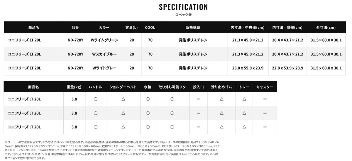 【シマノ|クーラー|ユニフリーズ|20L】| ユニフリーズ LT 20L ND-720Y |  | | | 魚を持ち帰ることを考えた新定番の釣り用クーラーボックスです。20Lクラスでありながら内寸45cmを確保、グッドサイズの魚を折り曲げずに持ち帰ることができます。UNISHIELDを採用することで、密閉性を高め移動時の水漏れや冷気漏れを軽減。両面開きの蓋は横に物があってもアクセス可能。ワンタッチ跳ね上げ構造の水栓は紛失の心配がありません。洗った時の水残りのしにくさなど、釣り用クーラーボックスとしてのメンテナンス性も向上しました。船のエサ釣り、堤防、近海のインショアボートなど幅広く活躍します。優れたスペック、使い勝手とコストパフォーマンスの良さをこのボックスに詰め込みました。 |