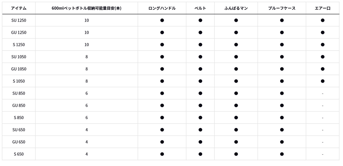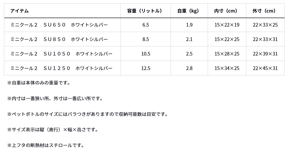 【ダイワ|クーラー|小型|10.5L】| ミニクール II SU 1050 |  | スポーツやアウトドアにピッタリ!ペットボトルや食べ物にも最適な小型クーラーに真空保冷タイプが新登場! | 用途に合わせて選べる12.5L、10.5L、8.5L、6.5Lの4サイズ、各6色展開。 高保冷の真空パネル仕様、ウレタン仕様、軽量スチロール仕様の3グレード。 サンドイッチやオニギリを濡らさず収納できるプルーフケース付き。 ペットボトル600mlが縦置き収納可能。12.5Lは最大10本、10.5Lは最大8本、8.5Lは最大6本、6.5Lは最大4本(6.5Lは横置き)。 別売では、プルーフケースPC-0810、CPアイスも収納可能。