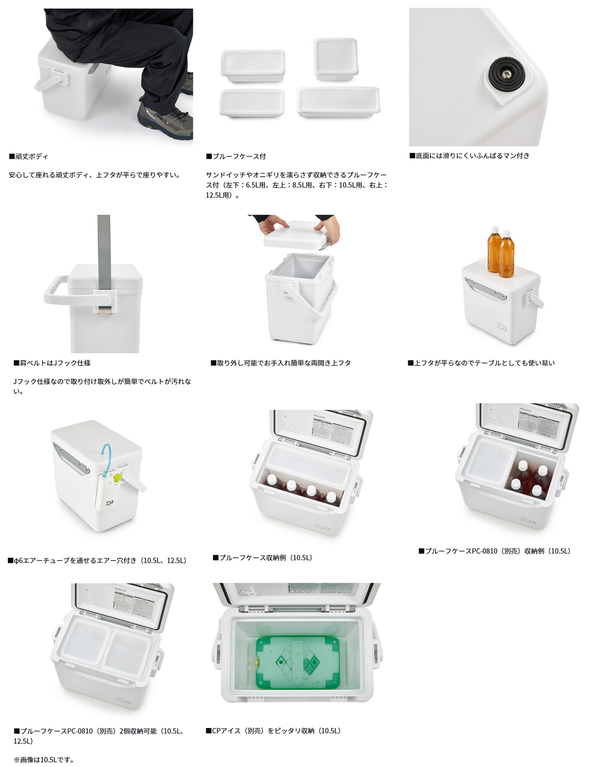 ・持ちやすいロングハンドルと肩ベルトが標準装備 ・取り外し可能でお手入れ簡単な両開き上フタ ・安心して座れる頑丈ボディ 上フタが平らで座りやすい ・底面には滑りにくいふんばるマン ・φ6エアーチューブを通せるエアー穴(12.5L、10.5L)付き |