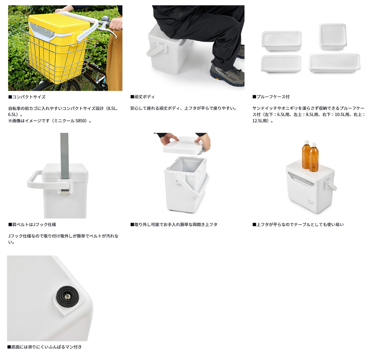 【ダイワ|クーラー|小型|6.5L】| ミニクール II GU 650 |  | スポーツやアウトドアにピッタリ!ペットボトルや食べ物にも最適な小型クーラーに真空保冷タイプが新登場! | 用途に合わせて選べる12.5L、10.5L、8.5L、6.5Lの4サイズ、各6色展開。 高保冷の真空パネル仕様、ウレタン仕様、軽量スチロール仕様の3グレード。 サンドイッチやオニギリを濡らさず収納できるプルーフケース付き。 ペットボトル600mlが縦置き収納可能。12.5Lは最大10本、10.5Lは最大8本、8.5Lは最大6本、6.5Lは最大4本(6.5Lは横置き)。 自転車の前カゴに入れやすいサイズ設計(8.5L、6.5L)。 別売では、プルーフケースPC-0810、CPアイスも収納可能。