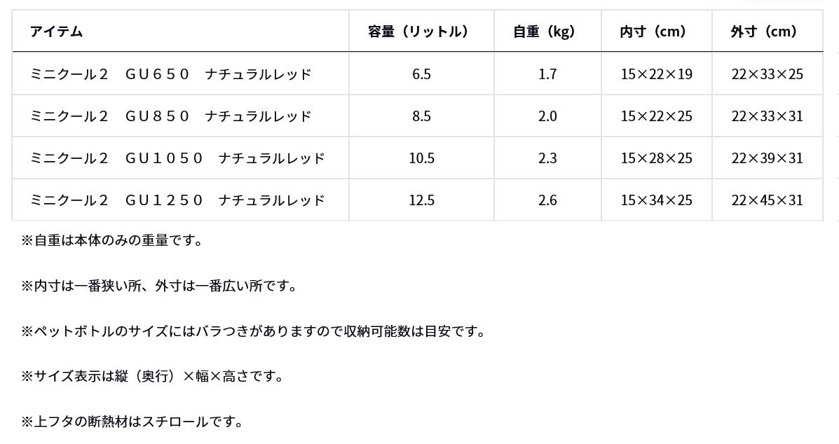 【ダイワ|クーラー|小型|10.5L】| ミニクール II GU 1050 |  | スポーツやアウトドアにピッタリ!ペットボトルや食べ物にも最適な小型クーラーに真空保冷タイプが新登場! | 用途に合わせて選べる12.5L、10.5L、8.5L、6.5Lの4サイズ、各6色展開。 高保冷の真空パネル仕様、ウレタン仕様、軽量スチロール仕様の3グレード。 サンドイッチやオニギリを濡らさず収納できるプルーフケース付き。 ペットボトル600mlが縦置き収納可能。12.5Lは最大10本、10.5Lは最大8本、8.5Lは最大6本、6.5Lは最大4本(6.5Lは横置き)。 別売では、プルーフケースPC-0810、CPアイスも収納可能。