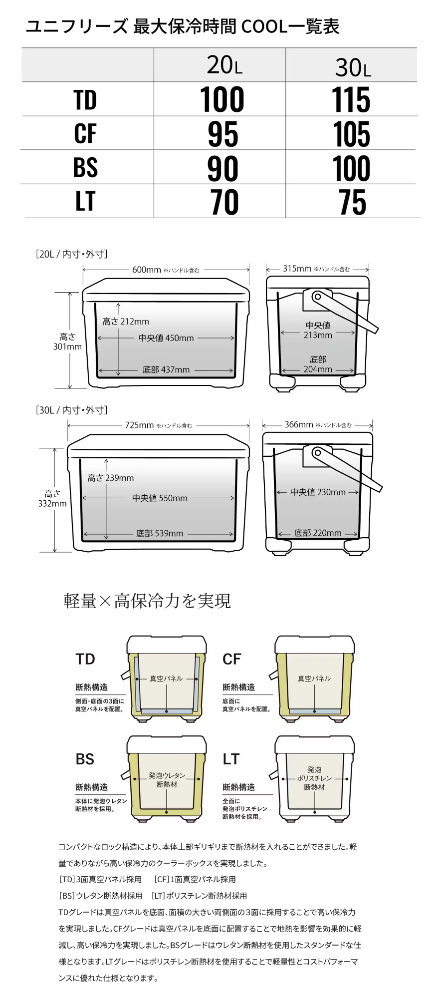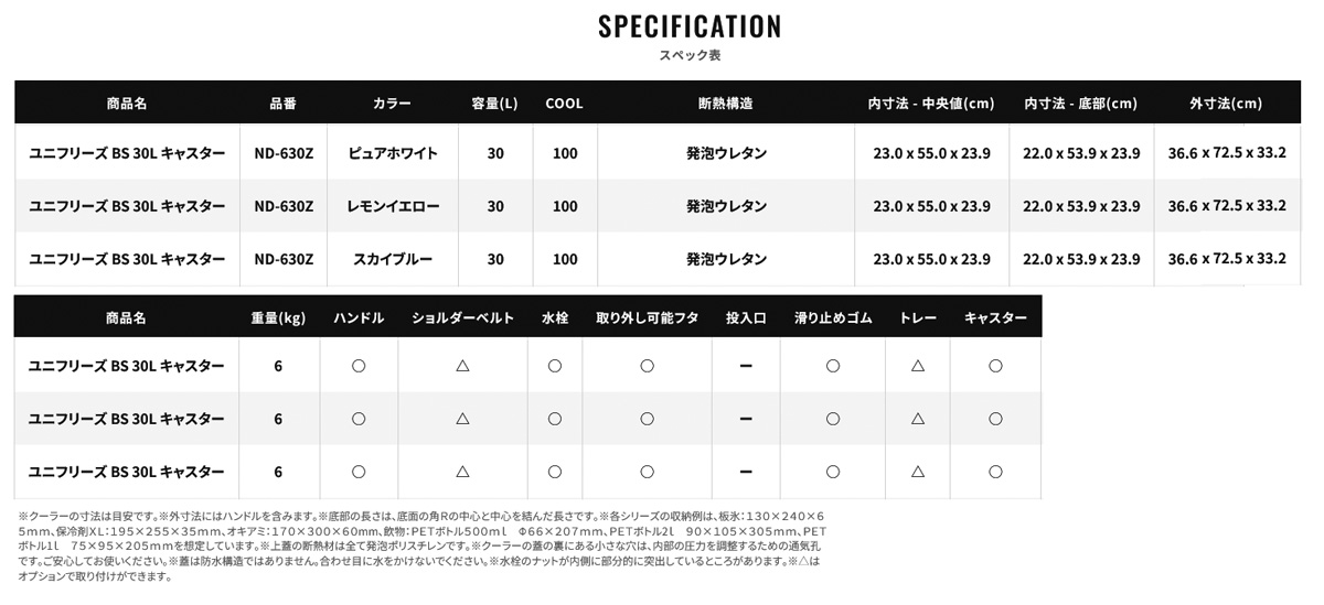 【シマノ|クーラー|ユニフリーズ|30L】| ユニフリーズ BS 30L キャスター ND-630Z |  | | | 魚を持ち帰ることを考えた新定番の釣り用クーラーボックスです。20Lは内寸45cmを確保、グッドサイズの魚を折り曲げずに持ち帰ることができます。30Lは内寸55cmを確保し、尺超えの魚も折り曲げずにそのまま収納でき、キャスター付きで移動もスムーズ。独自構造「UNISHIELD」により密閉性が高く、水漏れや冷気漏れを抑えやすくなっています。両面開きの蓋は、車内や船上の限られたスペースでも開閉しやすく、ワンタッチで開く跳ね上げ式水栓は使用後の水抜きも快適。底部に水が残りにくく、洗いやすさにも配慮されています。堤防釣りからインショアボート、船エサ釣りまで幅広く対応する、頼れるクーラーボックスです。 |