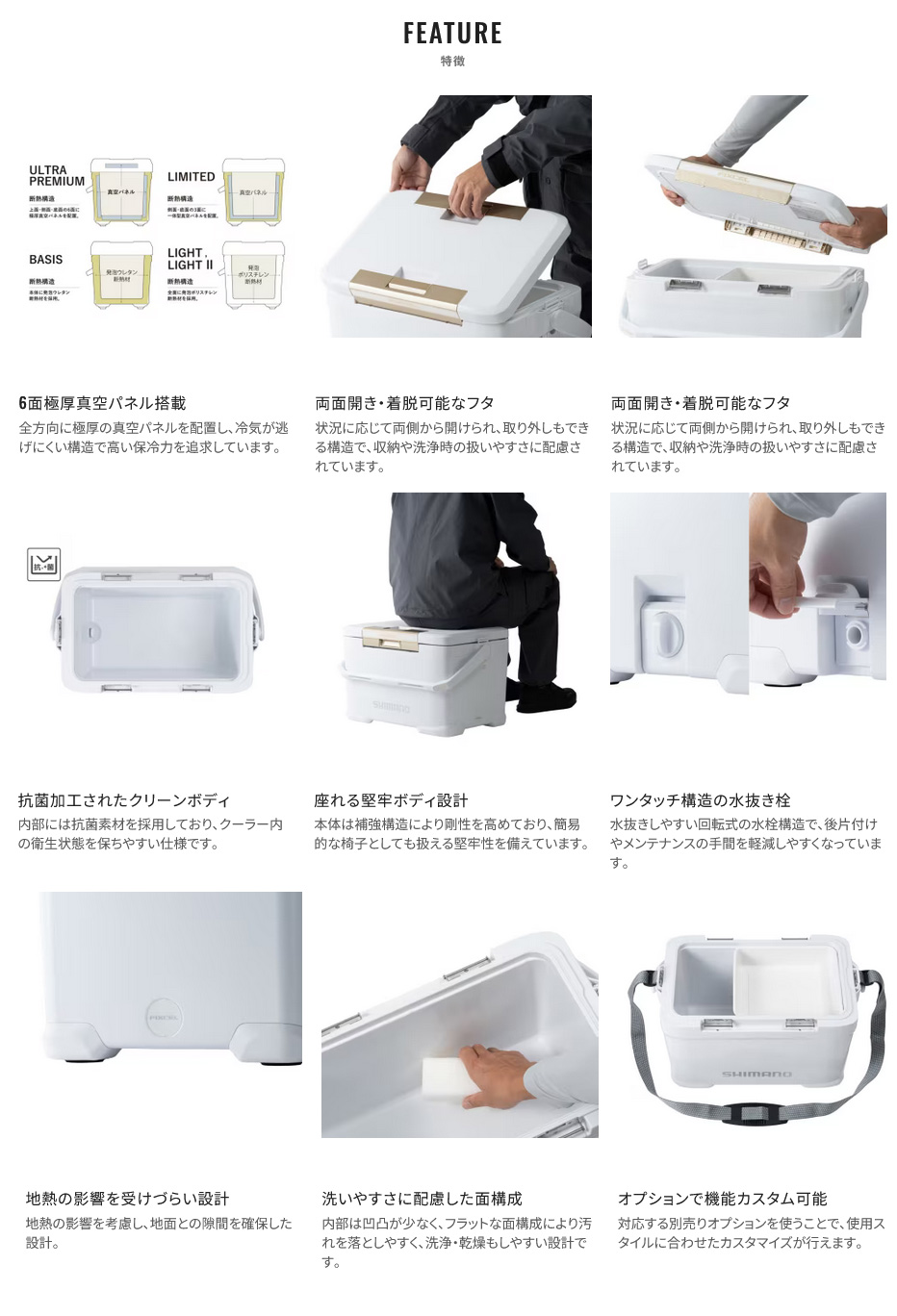| | 保冷力・操作性・堅牢性をバランスよく備えた、汎用クーラーボックスの中核モデル。モデルごとの仕様に合わせた断熱構造を採用し、釣行に必要十分な保冷性能に配慮しています。両面から開閉でき取り外しも可能なフタ、抗菌加工を施したボディ、水抜きしやすいワンタッチ水栓など、釣りでの使用を想定した使い勝手を追求。シンプルな面構成は洗いやすさや乾燥のしやすさにもつながり、メンテナンス性にも配慮されています。さらに、オプションパーツによる機能拡張にも対応し、スタイルや釣種に合わせたカスタマイズが可能です。 |