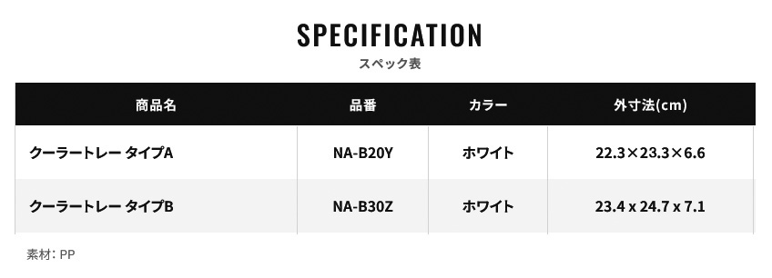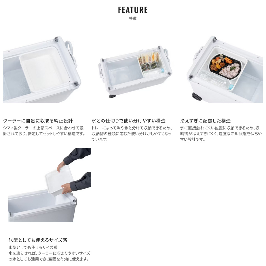 【シマノ|クーラートレー|クーラーパーツ】| クーラートレー タイプA・B NA-B20Y/NA-B30Z |  | | | クーラー内を効率的に使える純正トレー。食料や小物を魚と分けて収納しやすく、氷に直接触れさせたくない物の収納に適しています。トレー内の物が過度に冷えにくく、釣行時の食材管理にも配慮された構造です。さらに、このトレーを型として活用すれば、クーラーボックスにぴったり収まる氷の作成にも対応。クーラー上部に自然にフィットする設計で、整理整頓と保冷効率を高めたい方に向いたアイテムです。 |