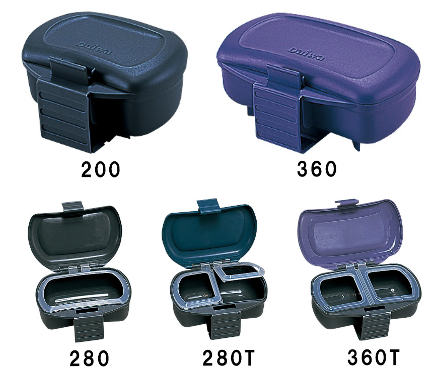 ミミズのはい上がりを防止するユニークなミミズ返しフレーム付き。 フレームを上蓋に固定すれば普通のエサ箱として使用可能。 中に仕切りのある「T」タイプは2種類のエサが収納可能。 ベルトにがっちり固定できるベルトロック式。