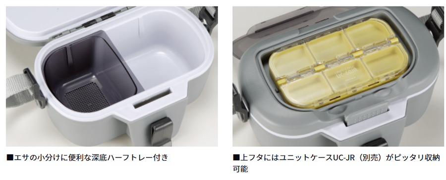立ち込んでもエサが濡れない首掛け式(首掛けベルトのたわみ防止機構、エサ箱を安定させるウェアークリップ付き)。 エサや小物の出し入れに便利な小フタにはユニットケースUC-JR(別売)シリーズもピッタリ。