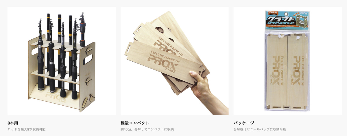 【プロックス|ロッドスタンド|組み立て式|渓流】| クラフトロッドスタンドタイプ1 |  | | 組み立て・分解が簡単なロッドスタンド!パックロッドや渓流竿に | 組み立て・分解が工具不要で簡単にできるロッドスタンド。 パーツを組んで簡単に組み立て。不要時は分解してコンパクトに収納。 パックロッドや渓流竿に最適なコンパクトサイズ。 木目の風合いも良い軽量木質合板を採用。