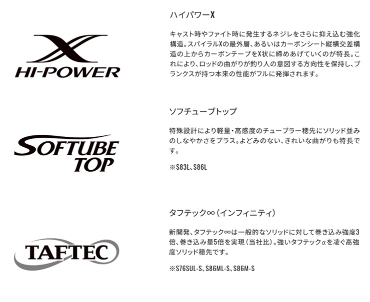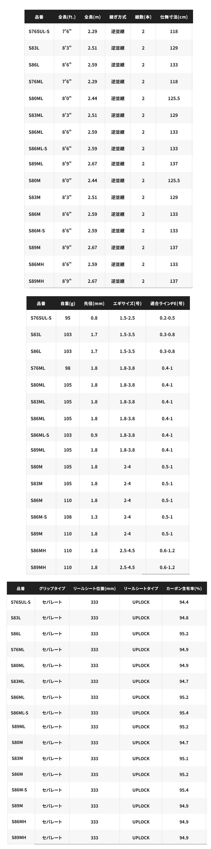 | ■S76SUL-S ライトエギング〜ソリッドモデル〜 ・小型のエギを扱いやすいモデル ・ライトゲームにも対応可能 参考対象魚・釣種 ヒイカ(ジンドウイカ)etc. ■S83L ライト&センシティブ ・操作性や軽快さを重視したレングス ・繊細なエギングを楽しみたいならこのモデル ■S86L ライト&センシティブ ・エギング定番のレングス ・繊細なエギングを楽しみたいならこのモデル ■S76ML テクニカル系ショート ・ボートからも投げやすいショートモデル ・高活性時の数釣りはもちろん、プレッシャーの高いタフなシーンでも活躍 ■S80ML テクニカル系ショート ・取り回しに優れたショートモデル ・高活性時の数釣りはもちろん、プレッシャーの高いタフなシーンでも活躍 ■S83ML テクニカル系オールラウンダー ・操作性や軽快さを重視したレングス ・高活性時の数釣りはもちろん、プレッシャーの高いタフなシーンでも活躍 ■S86ML テクニカル系オールラウンダー ・エギング定番のレングス ・高活性時の数釣りはもちろん、プレッシャーの高いタフなシーンでも活躍 ■S86ML-S テクニカル系オールラウンダー〜ソリッドモデル〜 ・エギング定番のレングス ・高活性時の数釣りはもちろん、プレッシャーの高いタフなシーンでも活躍 ・アタリを視覚でとらえやすいソリッド仕様 ■S89ML テクニカル系セミロング ・遠投性重視のセミロングモデル ・高活性時の数釣りはもちろん、プレッシャーの高いタフなシーンでも活躍 ■S80M ショートオールラウンダー ・取り回しに優れたショートモデル ・フィールドやシーズンを問わず活躍 ■S83M オールラウンダー ・操作性や軽快さを重視したレングス ・フィールドやシーズンを問わず活躍 ■S86M オールラウンダー ・エギング定番のレングス ・フィールドやシーズンを問わず活躍 ■S86M-S オールラウンダー〜ソリッドモデル〜 ・エギング定番のレングス ・操作性、遠投性、パワーをバランス良く備えたモデル ・アタリを視覚でとらえやすいソリッド仕様 ■S89M セミロングオールラウンダー ・遠投性重視のセミロングモデル ・フィールドやシーズンを問わず活躍 ■S86MH パワー系オールラウンダー ・エギング定番のレングス ・大型イカ狙いにマッチ ・深場や潮が速いエリアでも活躍する頼れるモデル ■S89MH パワー系セミロング ・遠投性重視のセミロングモデル ・大型イカ狙いにマッチ ・深場や潮が速いエリアでも活躍する頼れるモデル