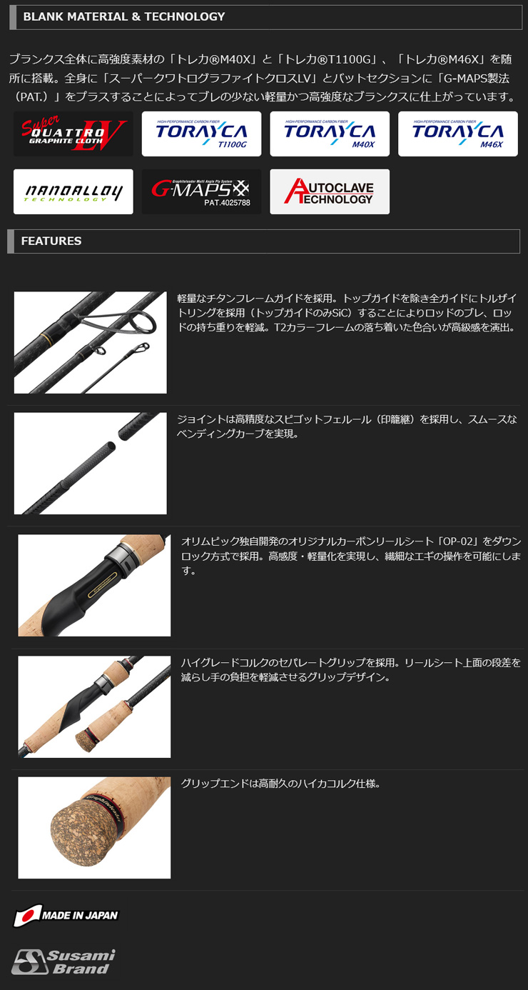 【オリムピック|ロッド|竿|エギングロッド】| 25 スーパーカラマレッティー AT (Super Calamaretti AT) |  | | オリムピックの技術を結集し具現化された「スーパーカラマレッティー」を、さらなる極限性能追求のため、東レカーボンマジック(株)協力のもとオートクレーブ製法を導入。製造過程の重要な役割を果たす焼成工程に、レーシングカーなどの極限性能を求める分野に利用されるオートクレーブ製法を用いることで、従来製法と比べより低樹脂の設計が可能になり、より高品位・寸法安定性に優れた仕上がりが可能となった。極限性能のブランクスを求め続けるカラマレッティーシリーズの現在における最高のエギングロッドが完成した。 |