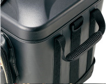 | | 上蓋・本体ともに成形樹脂を採用。上部からの雨やシブキ、衝撃にも対応します。 | 磯渡しの際やバッグの積み下ろしの時に便利な、滑り止め付きサイドハンドルを搭載しています。 |