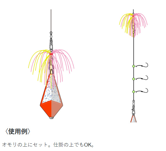 シリコンスカートが水中で花火のように舞い、視覚と波動でカワハギの心を捕えます。カワハギはもちろん、アイナメ、フグやカレイ、キス仕掛の天秤部にセットするなど、魚種も使い方もあなたのアイデア次第。