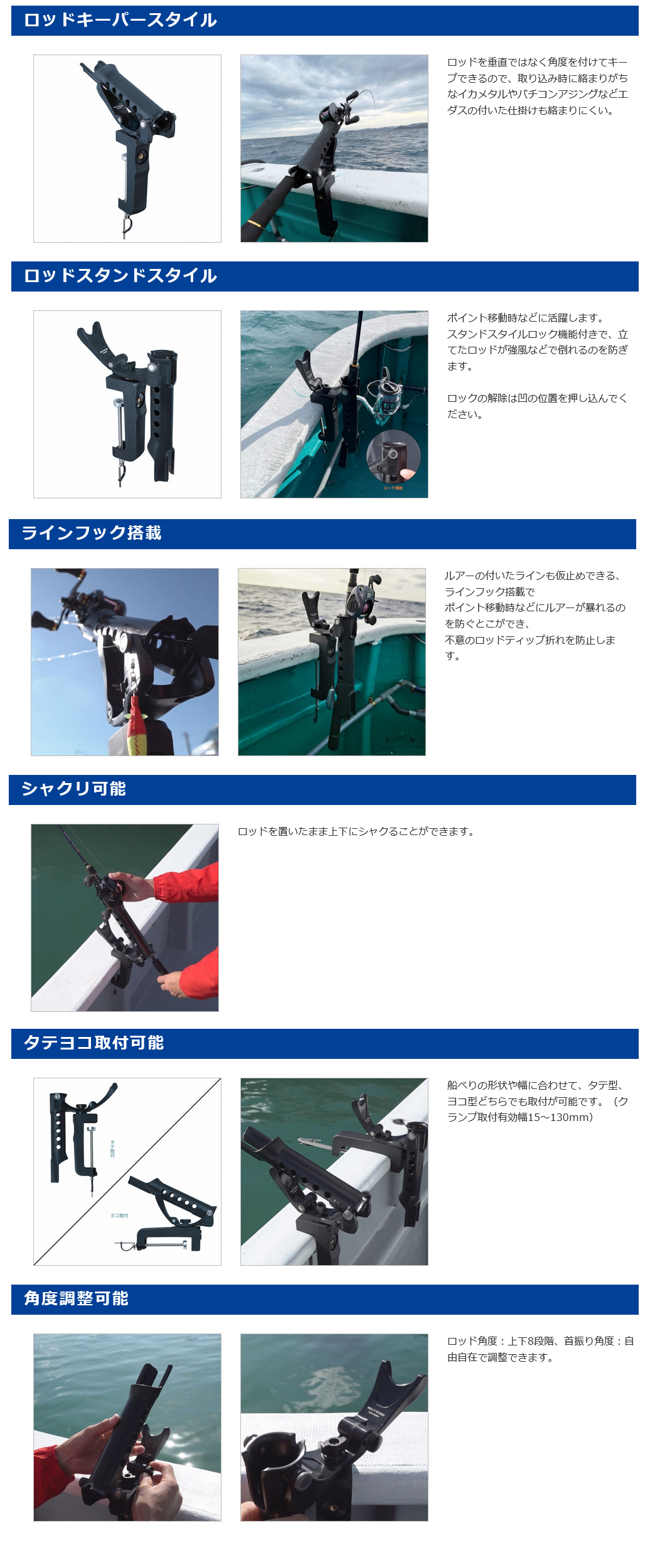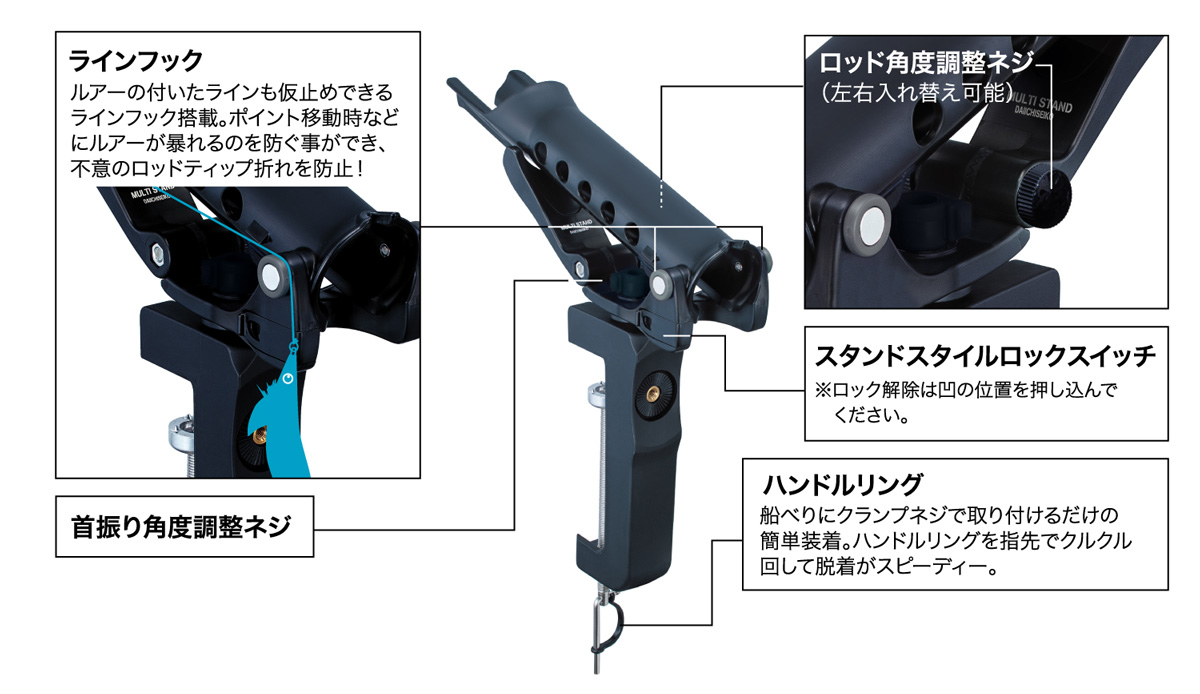 ●ロッドを完全に固定できる商品ではありません。 ロッドの不意な脱落にご注意ください。脱落した際のロッド・リール等の保証は致しかねます。 ●竿受の耐荷重はクランプの取付状況に左右されます。 滑面への取り付けはお控えください。 ●クランプネジは振動で緩むことがあります。締め付けられているか時々確認してください。 ●スタンドに立てたロッドを持って身体を支えないでください。 ●ロッドスタンドスタイルから、ロッドキーパースタイルに変更する際は、ロックを外して変更してください。 無理に力を加えると破損します。 ●船べりの形状によっては取付できない場合もあります。 ●金属部分についてはサビによる固着が起きますので、使用後は必ず真水で洗い、水気をよく切って注油後保管してください。 |