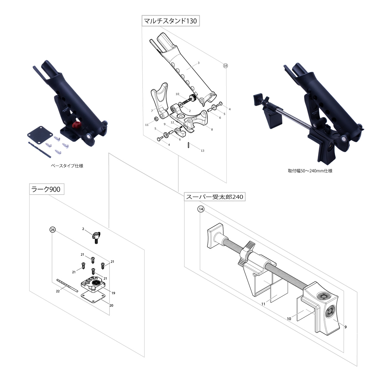 「スーパー受太郎240」の「NO.14 クランプセット(09330)」をパーツ購入して頂くことで、取付幅50〜240mmの超ロング仕様にすることが可能です。