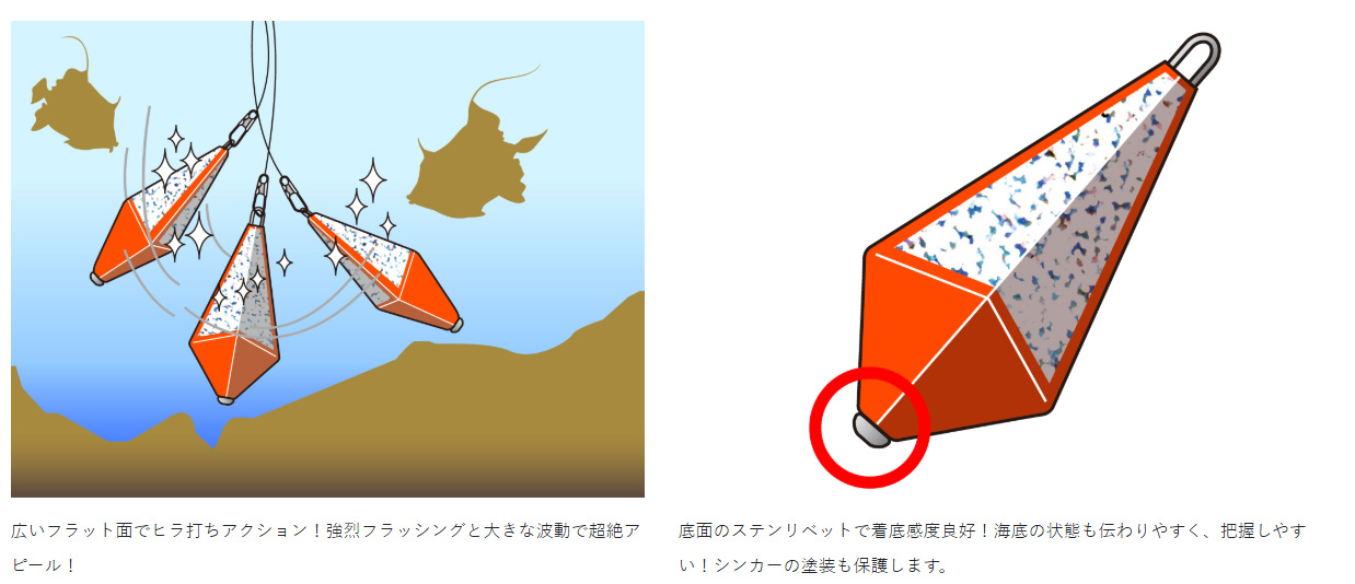 水切りの良いフォルムと大きなフラット面が、キレの良いヒラ打ちと強烈なフラッシング効果を生みだします。また、底部のステンレス・リベットが着底感度を増し、底質の感知能力も抜群です。