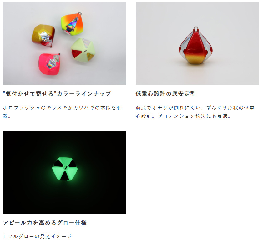 海底でシンカーが暴れない低重心の底安定型設計で操作性抜群。ゼロテンション釣法にも最適です。カワハギを遠くから寄せてくるアピールカラー+ホロフラッシュの強烈アピール仕様です。