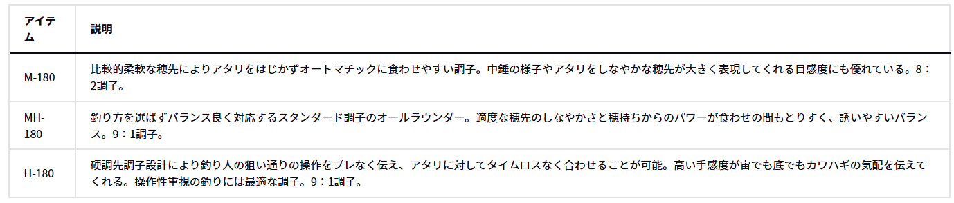 |  | アサリ等を使ったカワハギ釣り専用設計。アタリが見やすく、誘いやすい調子を追求。