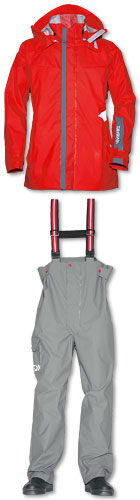 ジャケット・パンツ共にシルエットを改良したPVCレインスーツ。トリコロールイメージのブルーとレッドのジャケットカラーに汚れの目立ちにくいグレーカラーの配色。ジャケットの袖口は調整しやすいベルクロタブ仕様。パンツは着脱しやすいフロントロングファスナーでライン入りアクセントのサスペンダー仕様。 |