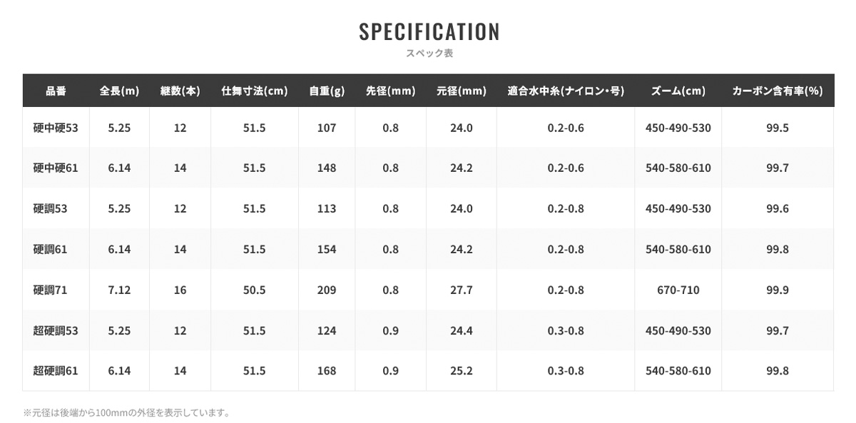 “X”で鍛えた実戦仕様 小継竿のニューベーシックモデル。 最新のテクノロジーで基本性能を強化した小継渓流竿のベーシックモデルです。クラスでは初となる「スパイラルX」を採用し、不快なブレを大幅に抑制。どの角度から振っても正確に仕掛けを打ち込むことができ、やり取りもパワフルに行えます。持ち重りも軽減され、振り心地は実にシャープです。穂先は軽量&高剛性の「タフテックソリッド穂先」を搭載。頭上を覆う木々の枝や岩にぶつけても破損しにくく、障害物に臆することなく、思い切った攻めを展開できます。ズームは3ウェイ(硬調71は2ウェイ)の「握るズーム」を採用し、河川の規模に合わせて3段階の長さを設定することが可能。多くの釣り場環境に対応するオールマイティな一本です。■スパイラルX ■タフテック ■マッスルカーボン ■しっとりグリップ ■握るズーム ■マイクロまわリリアン ■タフリリアン ■親切設計(硬調71を除く) ■仕掛巻兼用ベンチレーションキャップ(硬調71を除く) ■固着防止対策