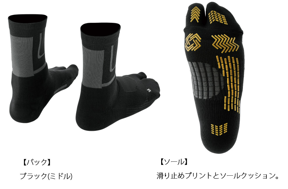 ●足首はテーピングサポート編みで可動部を包むようにホールドし、足首のぐらつきを抑えます。 ●先割れ構造と指裏の滑り止めで指先の踏ん張りをサポート。 ●土踏まずの空間にソールクッションを配置し、足裏への衝撃を緩和します。 ※着圧機能製品との併用はおやめください。また、本製品の2枚重ねでの着用もおやめください。 |