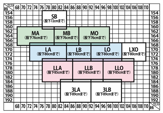 身長、ウェスト、股下の数値をご参照ください。 ■股下とは股間から土踏まずまでの長さを基準としています。 ■体型は個人差がありますので、部分によってタルミが出る場合もあります。 ■表のサイズは目安です。必ず試着の上最適なサイズをお選びください。 ■体質によっては着用中にかゆみ・かぶれが発生する恐れがあります。かゆみ・かぶれが発生した場合、すぐにご使用を中止し、専門の医師にご相談ください。