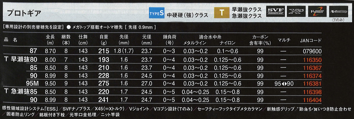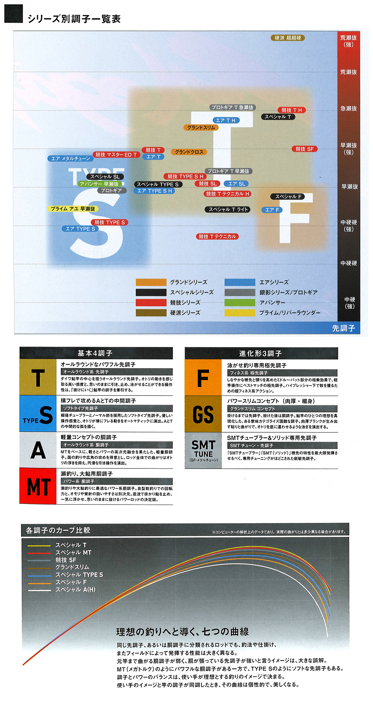 調子の分類は「TYPE S」ですが、他のSよりかなり胴調子にしてAのうな引き性能も備えさせました。ですので「TYPE S」の横の誘いをしながら、ゼロテンションの釣りから、泳がせ釣り、そして引き釣りまで幅広くこなします。また「90」と「87」が、軽さ、操作性、感度、そして回転力や風切り性能と様々な性能を引き上げてくれています。