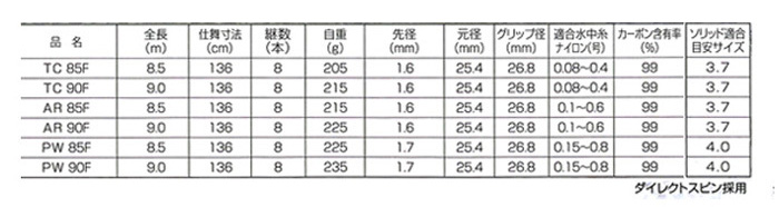 高弾性低レジンカーボンと節長さのバランスにより、強度、タメ性能は十分な仕上がり。 竿を構成する素材の無駄な部分を徹底的に分析し、取り除く事により、軽量化しました。野鮎にも負けないパワーを維持し、竿を信頼してタメていただけます。 パワー、タメ性能、軽量かつ操作性のよい超高水準のモデルです。TC:硬中硬テクニカルモデル。 AR:早瀬クラスはエリアを選ばないオールラウンダー。PW:急瀬クラスは余裕で攻める抜群のパワータイプ。