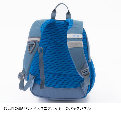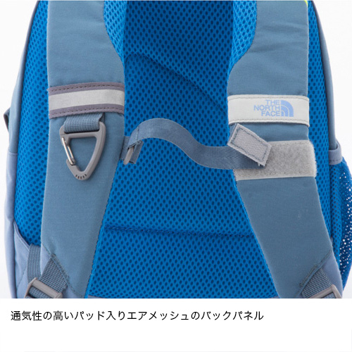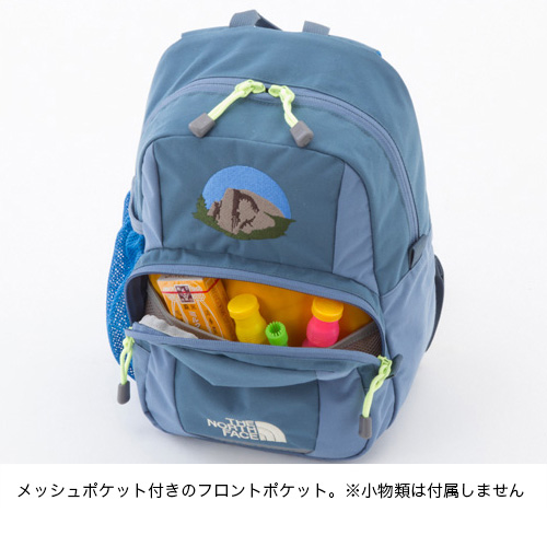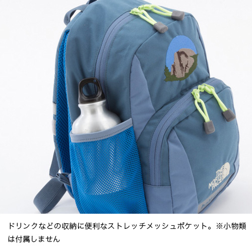 アウトドアキッズになるための人生最初のデイパック/背負い心地の良い柔らかい背面とショルダーハーネス/安全性を考慮したベルクロ式のチェストストラップ/内部にメッシュポケットがついたフロントジッパーポケット/ショルダーハーネスにフックつきDリング/左サイドにメッシュボトルポケット/本体とショルダー部分にリフレクター/内側にネームホルダー