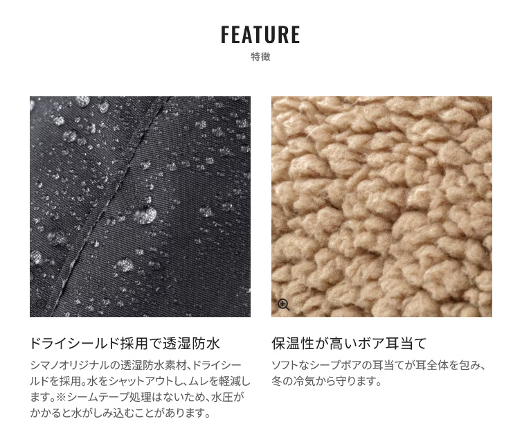 冷気から耳を守る保温性の高い耳当てが付いたボアキャップです。防水透湿性を備えた生地を使用しており、雨や雪に強く、快適な被り心地を実現しました。耳当て部分にはソフトなシープボアを採用し、高い保温性を確保しています。顎部分には薄型ワンタッチバックルの調整ベルトを採用しており、フィット感を調整することができます。