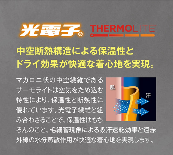 ●光電子®とは、特殊セラミックスの働きで、人の身体から発する遠赤外線のエネルギーを利用し体の芯まで温める。様々な素材と組み合わせることで、より効果的な保温効果が得られる。また、汗など水分の蒸散性、速乾性を向上させる特徴もある。 ●マカロニ状の中空繊維構造による保温性とドライ効果が快適な着心地を実現する「THERMOLITE®」を採用。 ●フルフィンガーモデル。 ●スムース裏起毛生地を使用。 ●インナー用グローブとしての活用可能。
