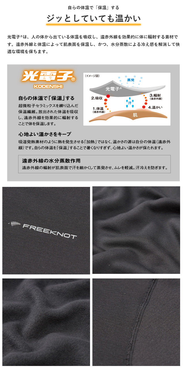【フリーノット|タイツ|防寒|裏起毛】| 光電子 レイヤーテック アンダーシャツ 超厚手(レディース)Y1659W |  | ■心地よい温かさをキープ 光電子®は、独自の高純度微粒子セラミックスを繊維に練り込むことで、人体が発する遠赤外線(体温由来)を吸収・輻射し、体を芯から温める素材です。発熱するわけではなく、自身の体温を効率よく利用する“自然な温かさ”が特徴。洗濯による効果の低下も少なく、長く使っても性能が維持されます。