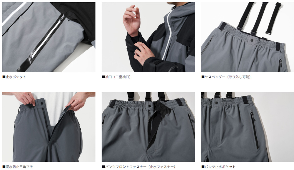 フード内側にはキャップインクリップ付きでキャップとフードの合体をすることで視界を広く保つ。 ウエスト部分に搭載しているループは、タオルハンガーとしても使用が可能。 パンツのずり下がりを防止するサスペンダーを標準装備。