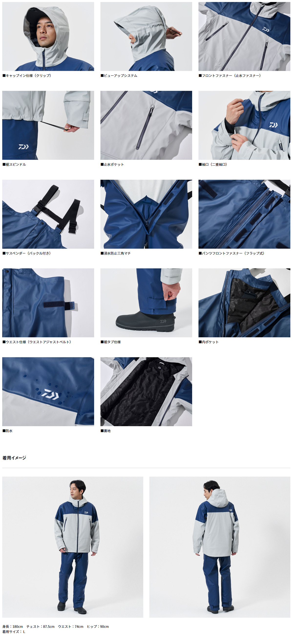 【ダイワ|防寒|PU素材|柔軟性】DW-6025 PUオーシャンウィンタースーツ  | 防汚性に優れたPU素材の中綿入り防寒オーシャンスーツ 汚れが付きづらく、柔軟性と防水性に優れたポリウレタン防水素材を使用。魚の血やコマセなどで汚れやすい船釣りに最適。100gの中綿入りモデル。フード内側にはキャップインクリップ付きでキャップとフードの合体をすることで視界を広く保つ。チェストハイパンツ形状で広い範囲を水や汚れから護る。パンツのウエスト両脇にサイズ調整用ベルトを装備しウエストのフィット感を素早く調整可能。ジャケットには止水ファスナーポケット、パンツには内側収納ポケットを搭載。 |  | 素材 表地:ポリエステル100%(ポリウレタン防水加工) 裏地:ポリエステル100% 中綿:ポリエステル 100% |