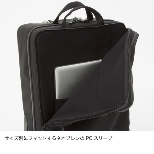 | 無駄をなくしたシンプルさと機能的なオーガナイザーで多用途なパッキングを提供する「シャトルシリーズ」のローラーバッグです。本体にはPCやタブレット、電源コードなどを効率よく収納することができるネオプレン製スリーブを設けています。このローラーバッグは左右どちらの手でハンドルを持った場合でも伸縮を操作でき、ホイール部分とともに十分な耐久性を持たせています。ほとんどの航空会社の機内持ち込みに対応したサイズで設定しています。 ※ハンドル長の段階調節不可(最大に伸ばした状態でのみ使用可能)