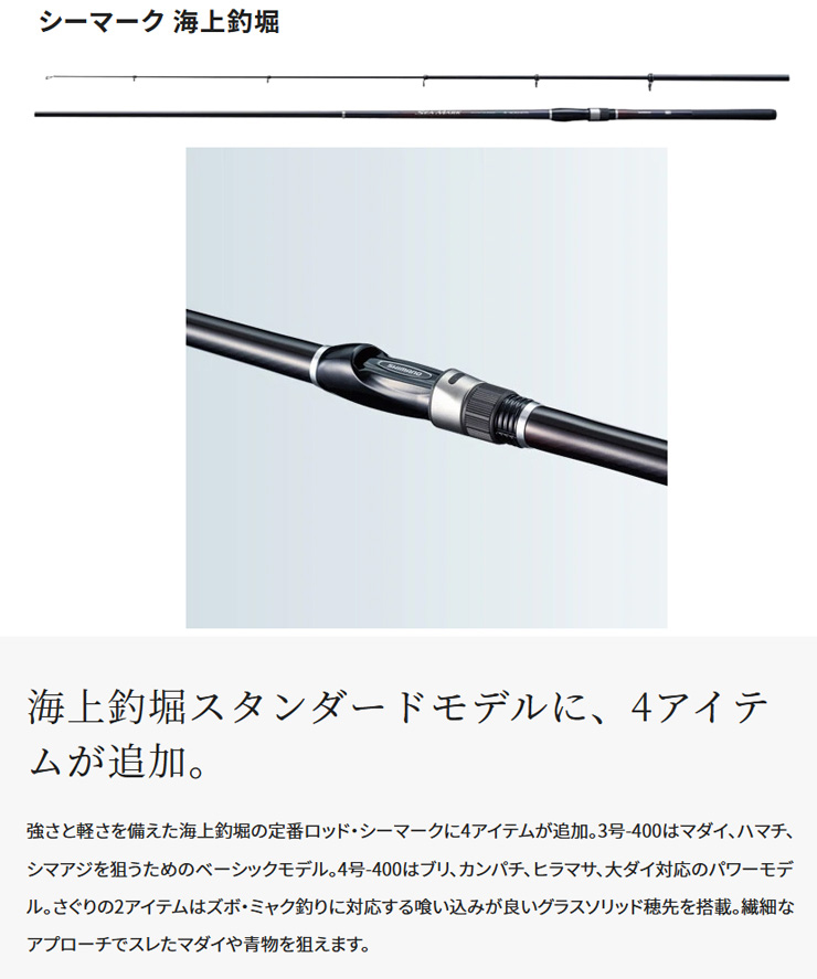 強さと軽さを備えた海上釣堀の定番ロッド・シーマークに4アイテムが追加。