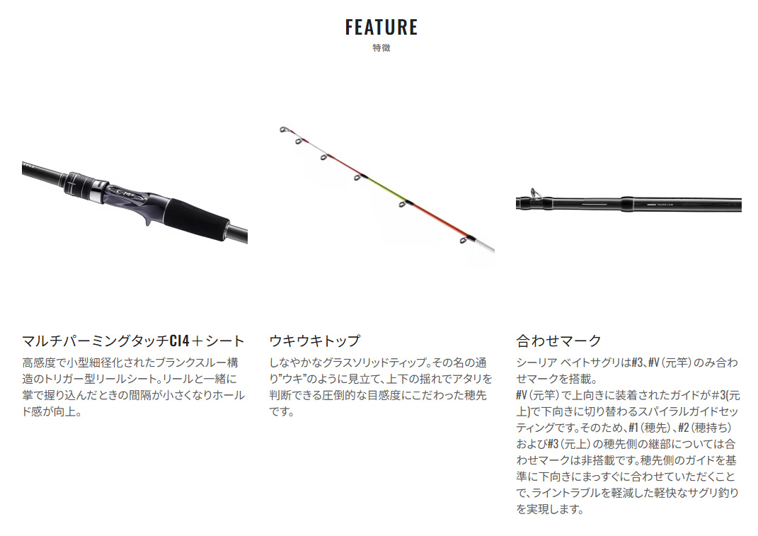 カウンター付きベイトリールを使用したサグリ釣りに最適な性能を提案するために誕生したSearea BAIT SAGURI 。この釣法において最大のストレスであるライントラブルの徹底追放を目的に並継・スパイラルガイドという独自のセッティングにより、糸ガラミを防ぎ、スムーズな釣りの展開をアシストします。要となるティップには魚からのアタリを鮮明に捉える高い目感度を備えたウキウキトップを搭載。とくにズボ釣りなどの錘負荷の大きい状況では、まるで空中にウキが浮いているかのように微かなアタリを鮮明にキャッチ。また、高いグリップ性能により、ダイレクトな操作を可能にするリールシートにはベイトリールに合わせたトリガー付きのマルチパーミングタッチCI4+を採用。リールシート長は脇挟みでの保持が可能で、操作時の疲労の軽減やファイト時の安定感を創出。ブランクスは基本構造スパイラルXを採用することで、ロッドのネジレを抑え、粘りとパワーを両立し、手返しの向上、不意の大物への対応力も強化。